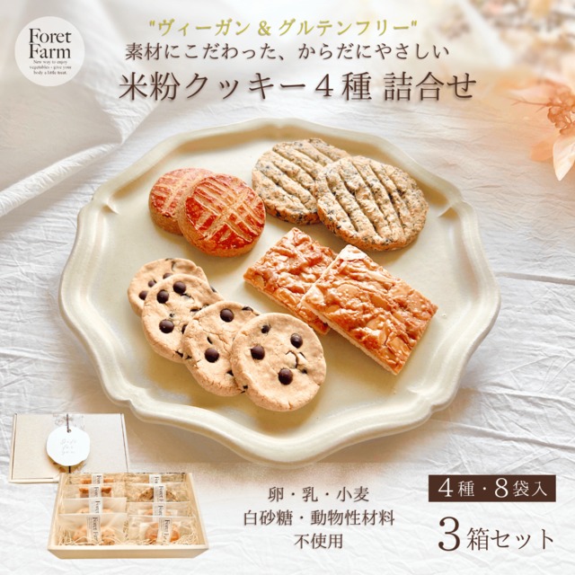 【米粉クッキー4種 詰合せ(8袋入×3箱セット・計24袋・個包装・送料無料)】 やさしい味わいの米粉クッキーを、4種類詰め合わせました。 卵・乳製品・小麦粉・白砂糖・動物性材料を使用しない、 グルテンフリー&ヴィーガン対応のクッキーです。 有機・国産・無添加の、からだにやさしい素材を大切に選び、ひとつひとつ丁寧に焼き上げました。 こちらは8個入ギフトを3箱セットにした、計24個のセットです。 ご家族でのおやつ用や、複数の方への贈り物、職場への差し入れなどにもおすすめです。 コーヒーや紅茶のお供に。 大切な方への贈り物や、ご自身へのご褒美時間にもぜひどうぞ。 〈セット内容〉 下記内容のセットを、3箱お届けします。 ⚫︎米粉のフロランタン (1袋・1個入)×2袋 厚めに焼いたサブレ生地に、アーモンドスライス入りのキャラメルソースを重ねて焼き上げた、フランスの伝統菓子です。 ⚫︎米粉のガレットブルトンヌ (1袋・1個入)×2袋 フランス・ブルターニュ地方の厚焼きクッキーを、バターの代わりに有機ココナッツオイルや洋酒を使って仕上げました。バターのような芳醇な香りとサクッとした食感が楽しめます。 ⚫︎香ばし黒ごまナッツクッキー (1袋・1個入)×2袋 有機黒ごまとアーモンド、カシューナッツなどをたっぷり混ぜ込んだ、香ばしい味わいのクッキー。栄養バランスもよく、毎日食べたくなる一枚です。 ⚫︎チョコチップクッキー (1袋・2個入)×2袋 米粉クッキー生地に有機チョコチップを加え、ザクザクとした食感に焼き上げました。 チョコの食べ応えと風味をしっかり楽しめます。 合計24袋入(8袋入×3箱) *こちらは3箱セット商品です(数量は1でご注文ください) 〈複数箱ご希望の方へ〉 2箱以上のご購入から、1箱あたりの価格がお得になっております。 2箱・4箱セットは、さらにお得な専用ページをご用意していますので、ぜひご利用ください。 【1箱】(8個入)4,150円 【2箱セット】(計16個)7,500円〈1箱あたり3,750円(1箱あたり400円お得)〉 【3箱セット】(計24個)10,650円〈1箱あたり3,550円(1箱あたり600円お得)〉 【4箱セット】(計32個)13,400円〈1箱あたり3,350円(1箱あたり800円お得)〉 〈5つの不使用〉 Foret Farmの米粉クッキーは、以下の素材を使用していません。 ・卵 ・乳製品 ・小麦 ・白砂糖 ・動物性原料 からだへの負担をできるだけ少なくし、素材そのものの風味を大切にしています。 〈素材へのこだわり〉 【小麦粉の代わりに国産米粉を使用】 小麦アレルギーの方にも配慮し、軽やかでやさしい食感に焼き上げました。 【バター・牛乳などの乳製品不使用】 バターや牛乳の代わりに有機ココナッツオイルや有機豆乳を使用しています。 ココナッツオイルは酸化しにくく、からだにやさしい植物性オイルです。 【甘みには北海道産甜菜糖や有機メープルシロップなどを使用】 ミネラルを含み、自然でやさしい甘さが広がります。 〈こんなシーンにおすすめ〉 ・お誕生日や記念日の贈り物に ・内祝いやささやかなお礼に ・自分へのご褒美時間に ・引っ越しや退職時のご挨拶に ・友人宅や取引先への手土産に ・ご自宅用と贈り物用を分けたい方に ・複数の方へ配るギフトとして 日々のおやつや、ささやかな贈り物にぜひお役立てください。 *セット内容は季節や製造状況により一部変更になる場合がございます。 〈食品成分表示〉 【米粉のフロランタン】 ⚫︎原材料名|アーモンド,有機ココナッツオイル,国産米粉,甜菜糖(北海道産),有機豆乳,有機メープルシロップ,天日塩,有機コーヒー(カフェインフリー・フェアトレード) ⚫︎内容量|24g(平均値) ⚫︎栄養成分表示1個24gあたり 熱量151Kcal,蛋白質1.9g,脂質10.4g,炭水化物12.8g,食塩相当量0.1g 【米粉のガレットブルトンヌ】 ⚫︎原材料名|国産米粉,有機ココナッツオイル,甜菜糖(北海道産),アーモンドパウダー,豆乳ヨーグルト(国産大豆),洋酒,ベーキングパウダー(アルミフリー),天日塩 ⚫︎内容量 |21g(平均値) ⚫︎栄養成分表示|1個21gあたり 熱量156Kcal,蛋白質1.5g,脂質11g,炭水化物12.2g,食塩相当量0.1g 【香ばし黒ごまナッツクッキー】 ⚫︎原材料名|国産米粉,有機黒ごま,有機ココナッツオイル,有機メープルシロップ,有機オートミール,甜菜糖(北海道産),有機豆乳,アーモンド,カシューナッツ,ベーキングパウダー(アルミフリー),天日塩 ⚫︎内容量|27g(平均値) ⚫︎栄養成分表示|1袋1個(27g)あたり 熱量147.5Kcal,蛋白質2.5g,脂質8.2g,炭水化物16.3g,食塩相当量0.1g 【チョコチップクッキー】 ⚫︎原材料名|国産米粉,有機ココナッツオイル,有機チョコレートチップ(乳不使用),甜菜糖(北海道産),アーモンドパウダー,有機コーンスターチ,有機豆乳,天日塩 ⚫︎内容量|25g(平均値) ⚫︎栄養成分表示|1袋(25g)あたり 熱量146Kcal,蛋白質1.7g,脂質8.9g,炭水化物14.5g,食塩相当量0.1g 〈保存方法・賞味期限〉 ⚫︎保存方法|直射日光・高温多湿を避け、涼しい場所で保存。 ⚫︎賞味期限|2週間以上あるものをお届けします。 〈送料・配送について〉 ⚫︎送料無料(北海道・沖縄を除く) ⚫︎