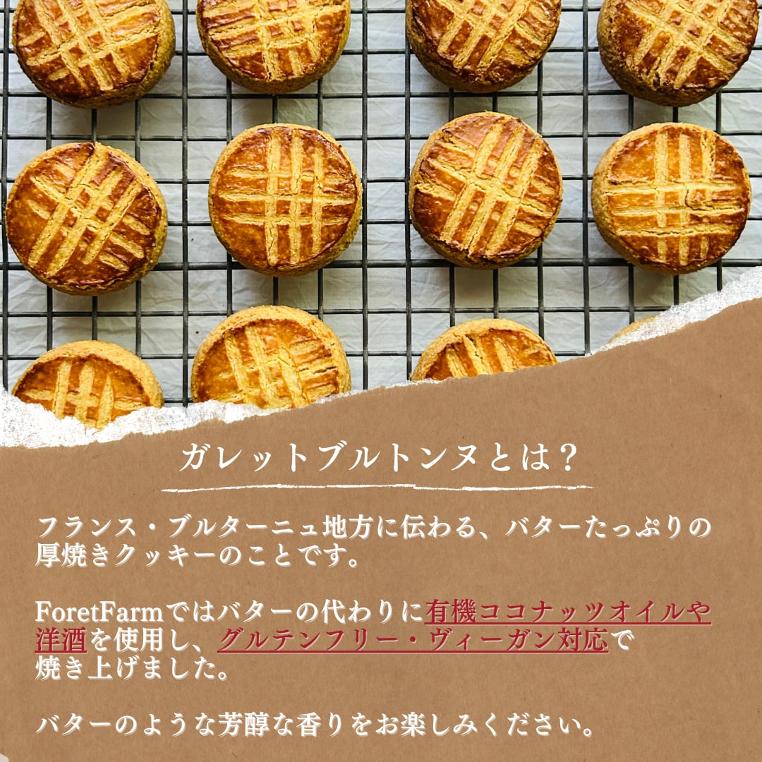 小麦・卵・乳製品・白砂糖・動物性材料を一切使用せず、ナチュラルな素材で焼き上げた、グルテンフリー&ヴィーガン対応のクッキーです。