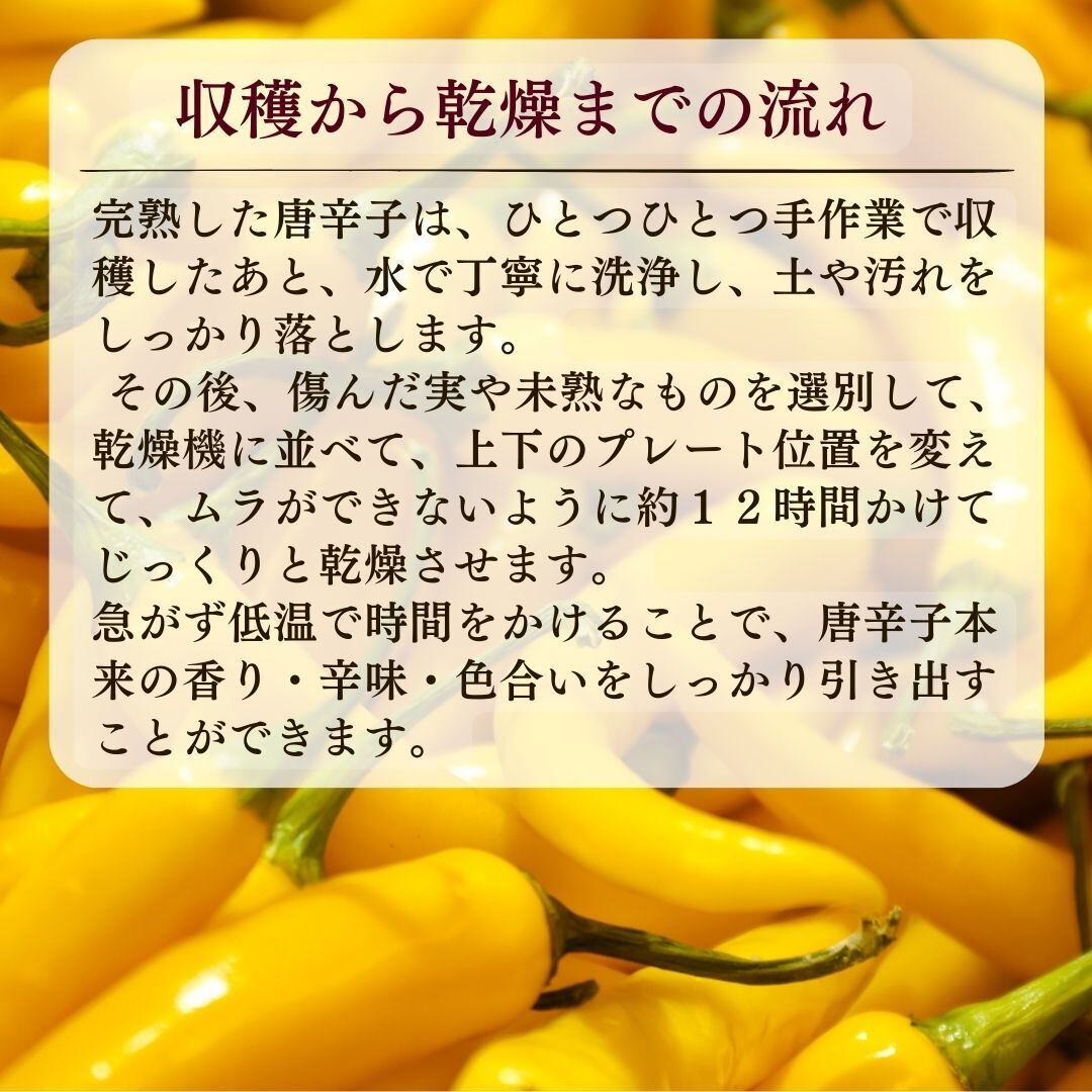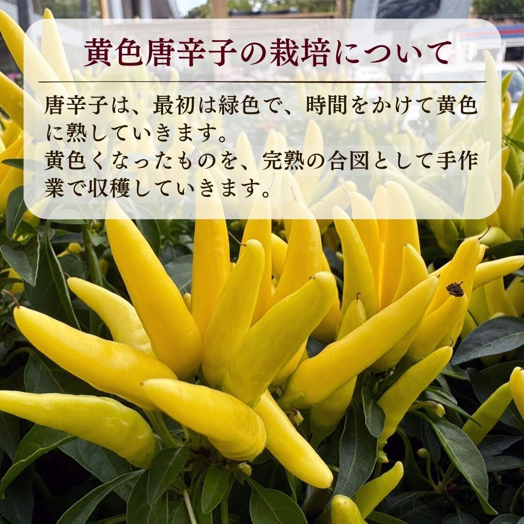 岡山県で育まれた有機JAS認証の黄金唐辛子は、豊かな自然の中で有機農法を用いて丁寧に育てられた唐辛子です。刺激の強い辛さが感じられ、料理に華やかな色合いと風味をプラスします。