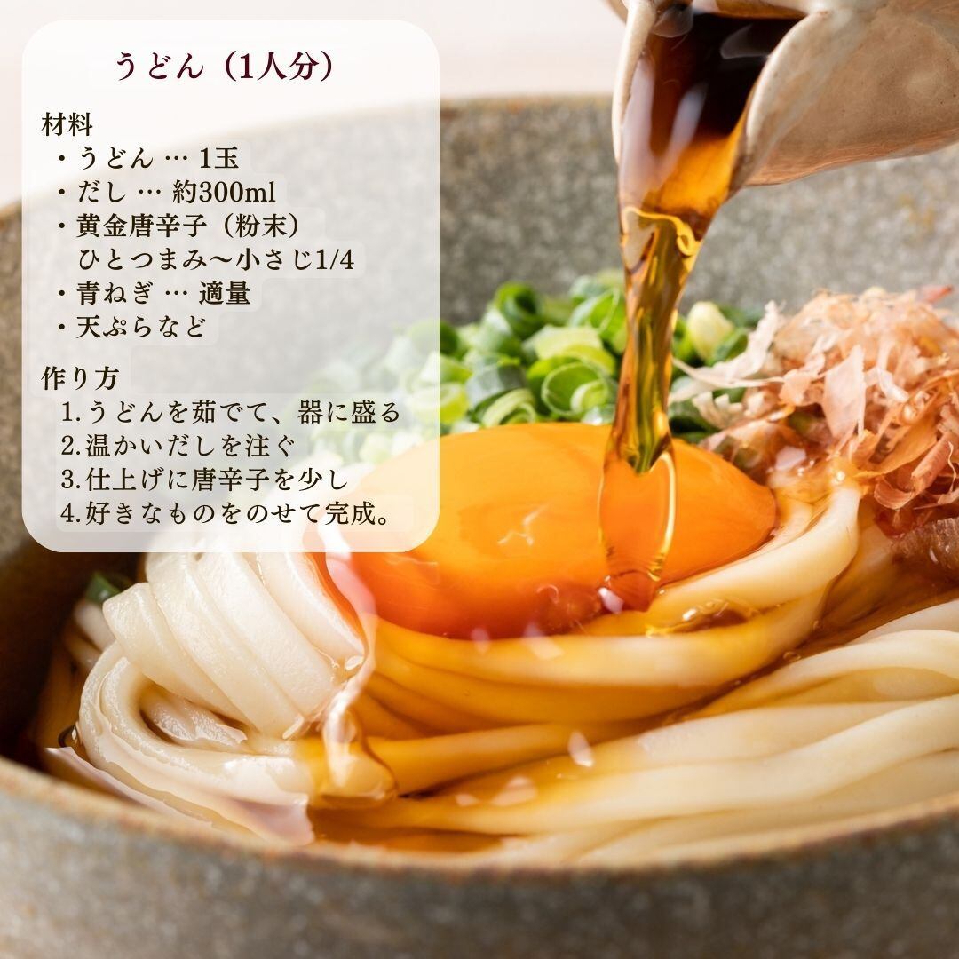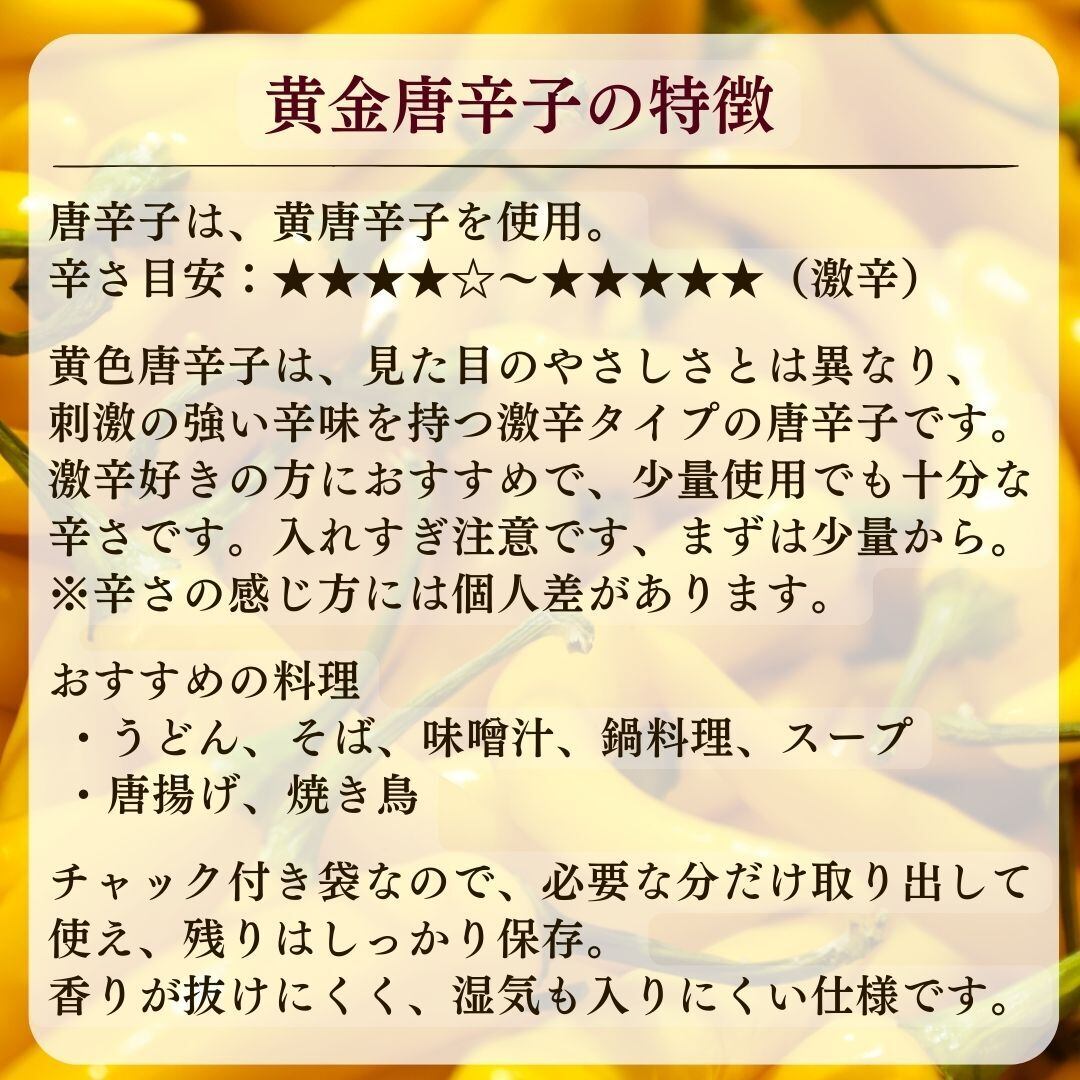 この黄金唐辛子は、家庭のキッチンからプロの調理場まで幅広く活躍します。カレー・煮物・炒め物はもちろん、うどんやそば、さらにはピザやサラダにもちょっと特別なアクセントを添えることができます。辛さはお好みで調整できるため、料理の幅が広がるのも魅力です。