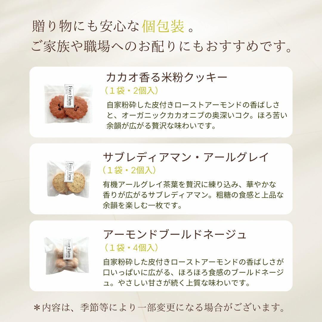 毎日のおやつにはもちろん、クッキー詰め合わせのギフトや手土産としても安心してお選びいただける、やさしい味わいのヴィーガンスイーツ・ヘルシースイーツです。