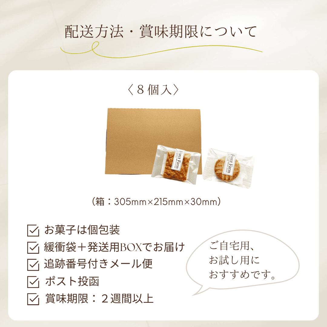 4枚ずつ詰め合わせ、ギフト用にラッピングした、ForetFarm定番の焼き菓子セットです。